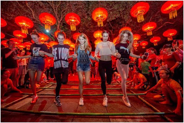 ↑竹竿舞是海南研學游備受游客喜愛的項目之一。 賈小英 攝