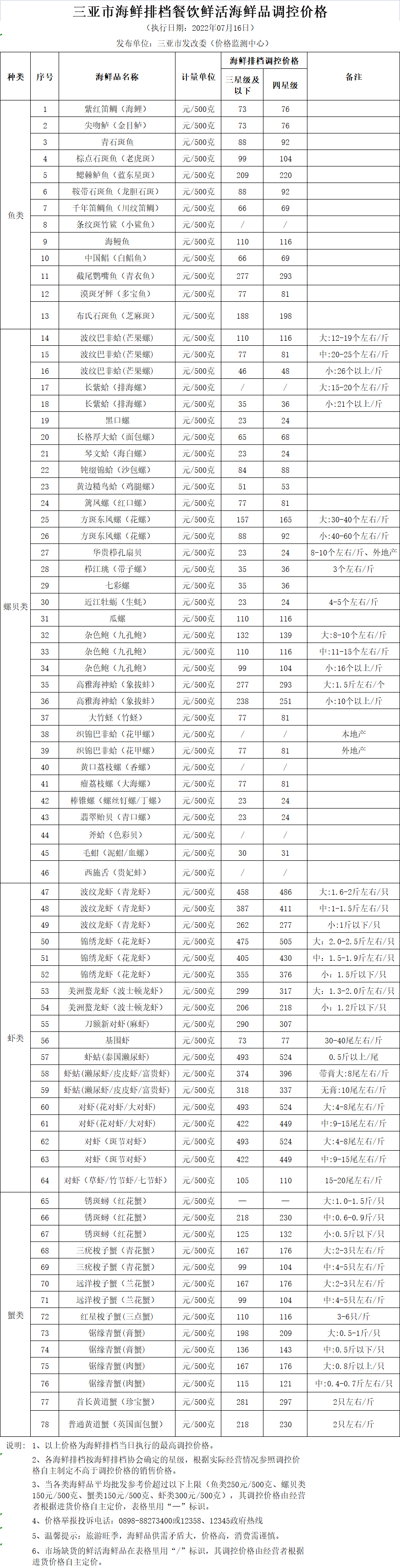 三亞市海鮮排檔餐飲鮮活海鮮品調(diào)控價(jià)格(2022.07.16)