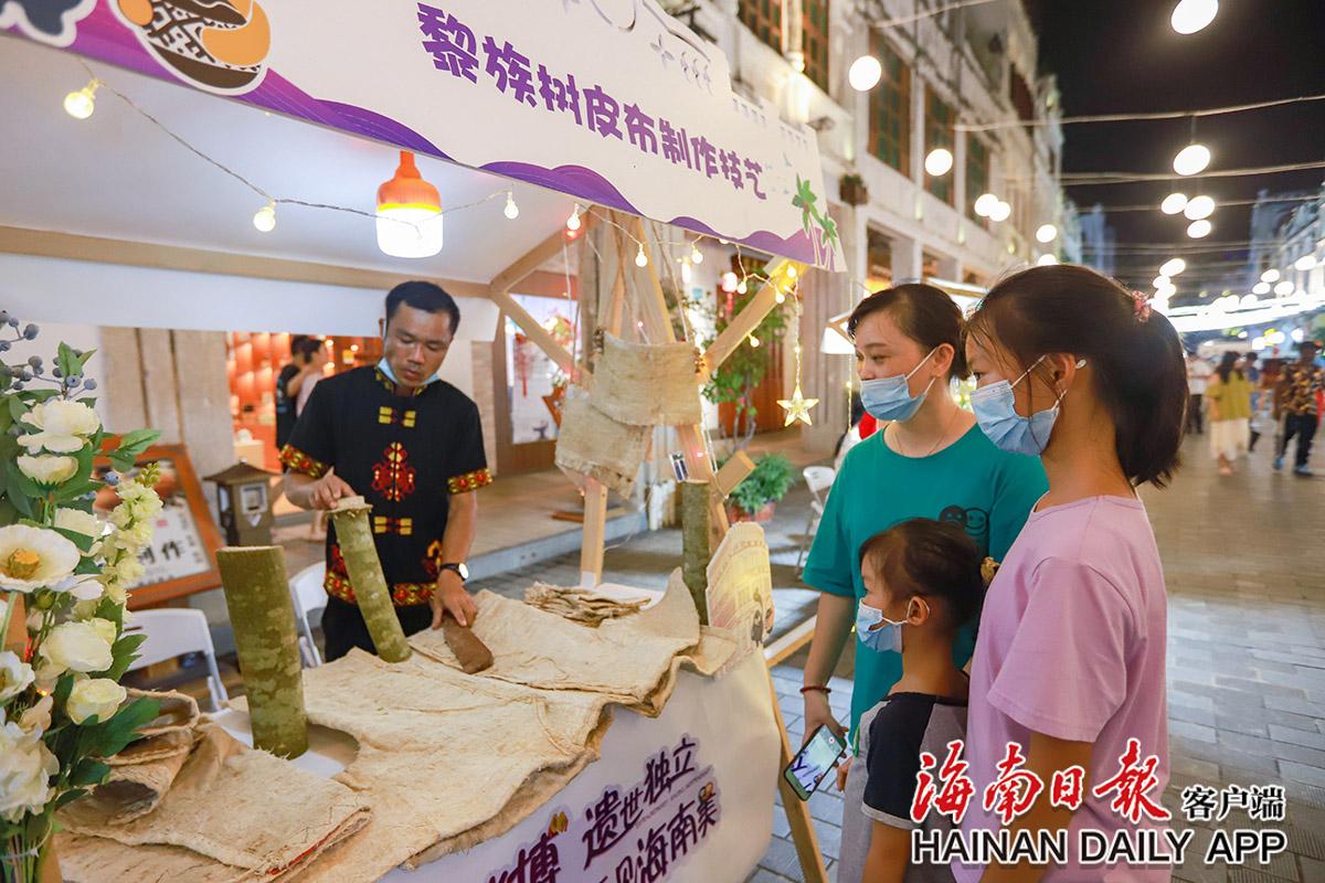 7月26日,“非”凡消博“遺”世獨立 讓世界看見海南美非遺特色展在海口龍華區(qū)騎樓老街舉行,市民游客參觀黎族樹皮布制作技藝。海南日報見習記者 王程龍 攝