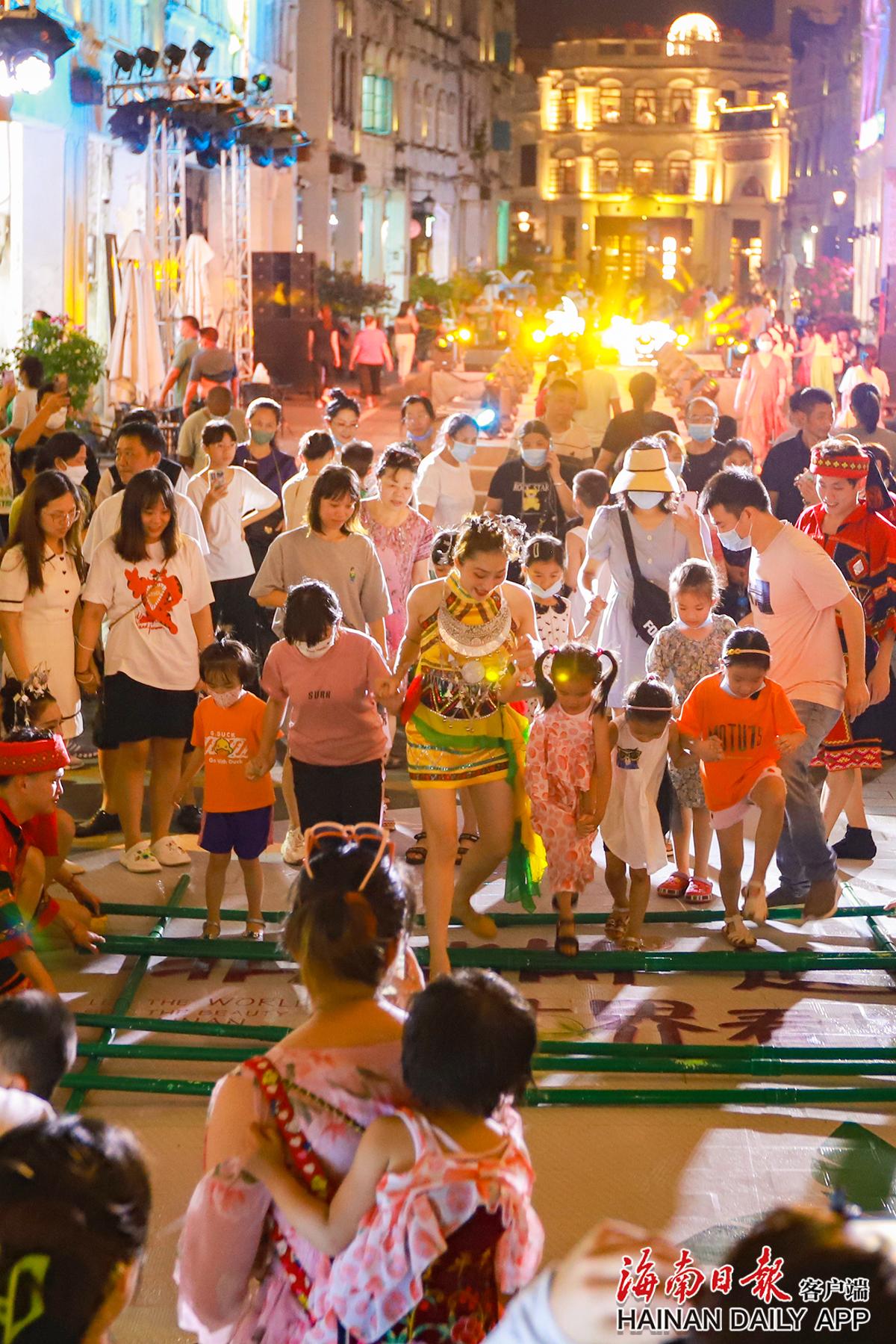 7月26日,“非”凡消博“遺”世獨立 讓世界看見海南美非遺特色展在海口龍華區(qū)騎樓老街舉行,市民游客與表演者一同跳起竹竿舞。海南日報見習記者 王程龍 攝