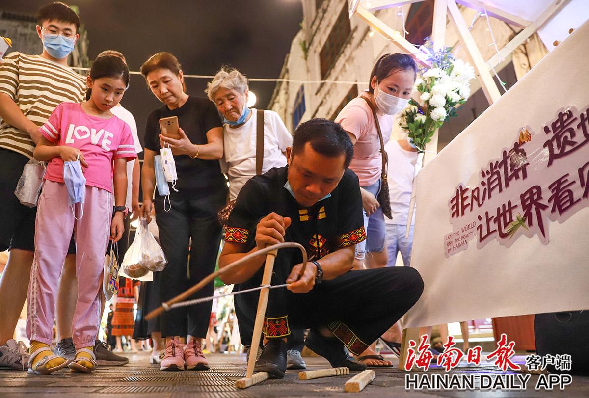 7月26日,“非”凡消博“遺”世獨立 讓世界看見海南美非遺特色展在海口龍華區(qū)騎樓老街舉行,圖為非遺傳承人王召方展示鉆木取火技藝。海南日報見習記者 王程龍 攝