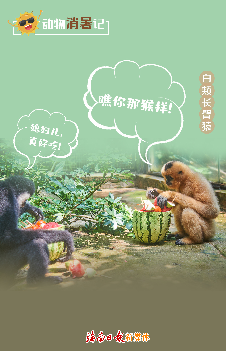皮綠瓤紅、汁多味甜的西瓜也是動物們的消暑利器。保育員將西瓜遞到亞洲象的鼻子旁,只見它輕輕一挽,5斤西瓜很快就被它吃光;泡水的河馬偶爾會出水,張著大嘴等待保育員投喂西瓜,“咔嚓咔嚓”,吃得甚是暢快淋漓;白頰長臂猿“命大”和“亮亮”兩口子,各自捧著塞滿西瓜、番石榴、西紅柿等水果的果盤,東瞅瞅西翻翻……