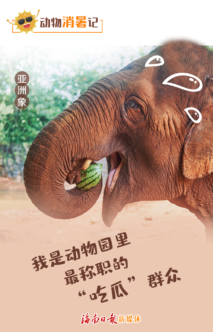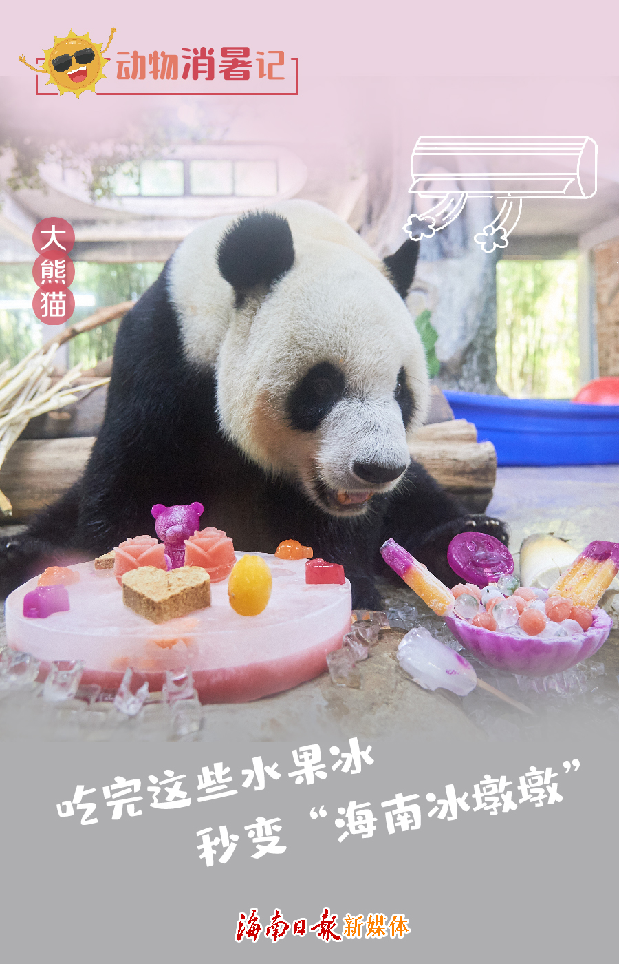 在海南,三伏天的午后,氣溫攀升,濕熱的空氣容易使人無精打采,動物也不例外。面對陣陣暑氣,為了給動物們消暑納涼,海南熱帶野生動植物園的保育員們使出了渾身解數(shù)。下面一組創(chuàng)意海報,帶你看看動物們的消暑“涼方”。