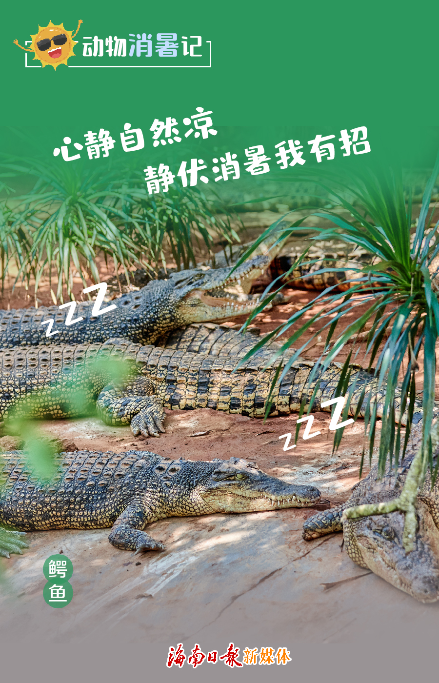 大熱天,水池旁的鱷魚們也選擇了“躺平”,成群結(jié)隊靜伏在岸邊,享受臥水靜伏自然涼。太陽暴曬時,它們就潛入水下,偶爾出來冒個泡、喘口氣。