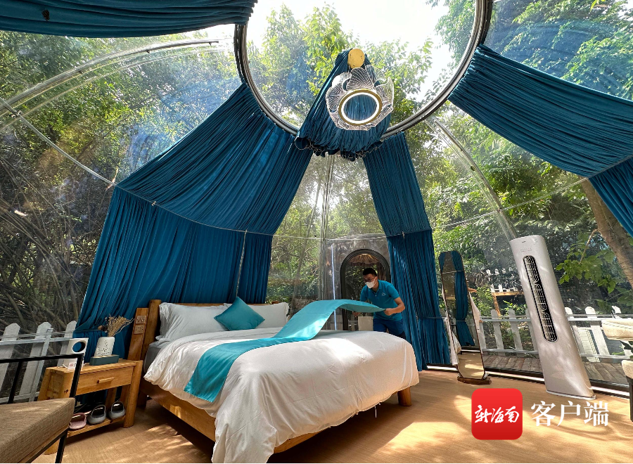 9月29日,工作人員在三亞大小洞天整理星空屋。記者沙曉峰攝