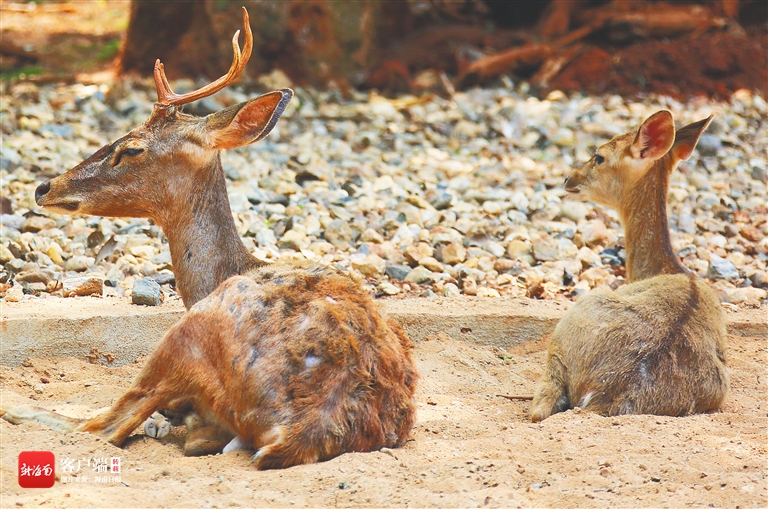 在海南熱帶野生動(dòng)植物園內(nèi),大小坡鹿臥地休息。海南日?qǐng)?bào)記者 李天平 攝