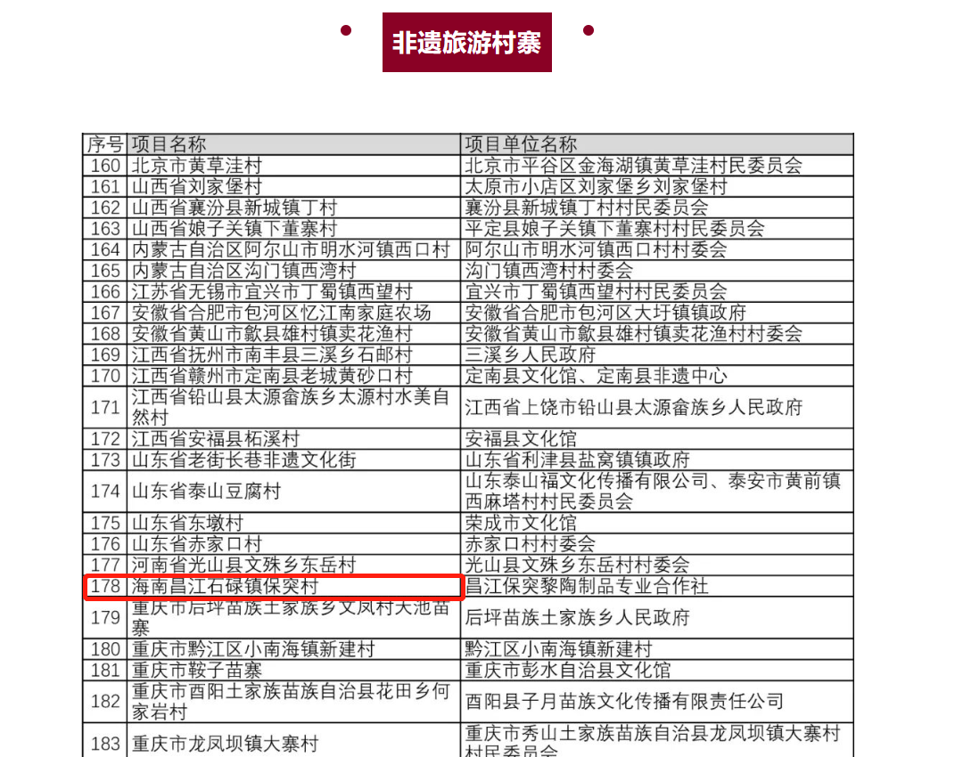 海南入選2022年“全國非遺與旅游融合發展優選項目名錄”的項目具體為:海南省三亞南山國際非遺中心——三亞南山文化旅游區、海南檳榔谷黎苗文化旅游區入選非遺旅游景區;海南昌江石碌鎮保突村入選非遺旅游村寨。