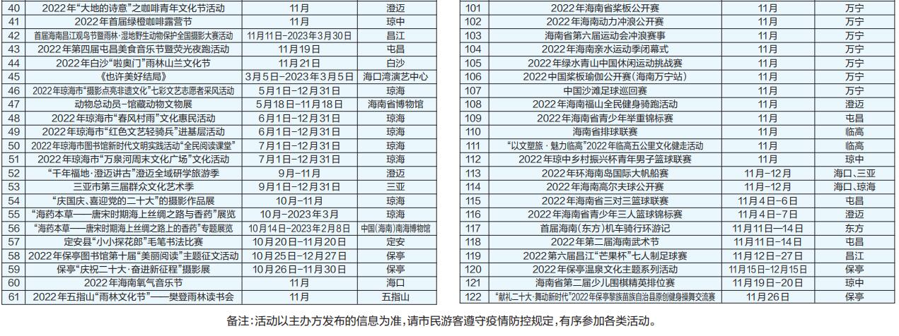 疫散云開,重見海南。為持續(xù)激發(fā)文化、旅游和體育消費活力,海南11月將推出百余場旅文體活動(具體活動詳情可關(guān)注“陽光海南網(wǎng)”公眾號和下載“智游海南”APP)。