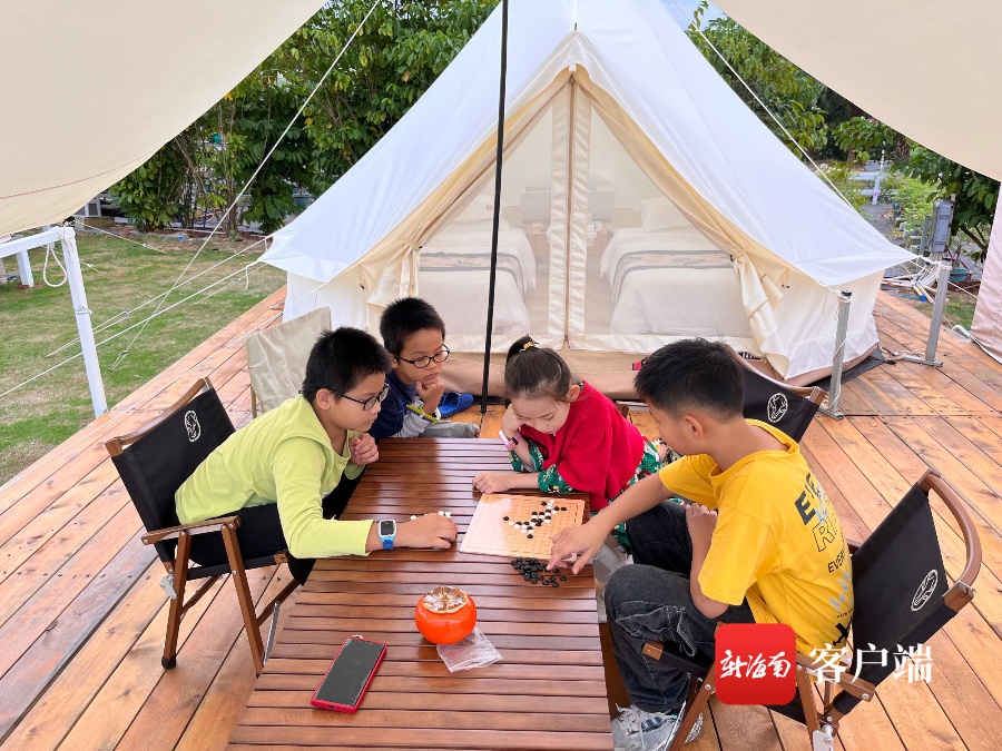 “來,食指沿著外緣放,手心貼緊盤緣……”在海口醉愛花田輕奢露營地,學子小小正在教同伴源源玩飛盤。