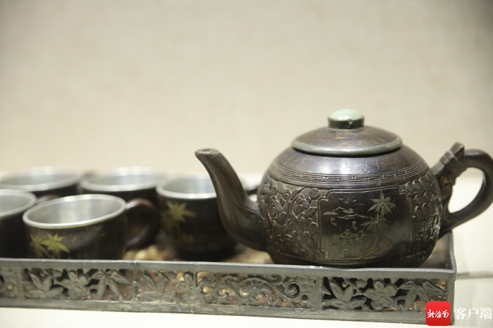 蔡於良告訴記者,此次展出椰雕是他從世界各地收藏而來,海南椰雕工藝歷史悠久,明清時期,椰雕工藝逐漸成熟,從明代中期開始把椰雕與銀錫金屬的結合,椰雕溫酒壸、提梁壺,執(zhí)壺、蓋碗、餐碗,乳茶碗、盤、公道杯、小酒杯都要鑲嵌銀、錫金屬。“本次展出椰雕東坡赤壁游圖銀鎏金乳茶杯是從日本花了40多萬買回來的,是一件清朝時期椰雕品。”