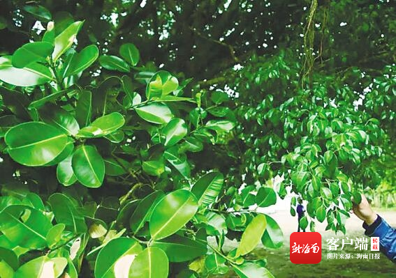 海口市三門坡鎮文嶺村委會兌水園村關帝廟前110多歲的瓊崖海棠古樹,已被榕樹團團圍住。左側大葉為瓊崖海棠。蘇弼坤 攝