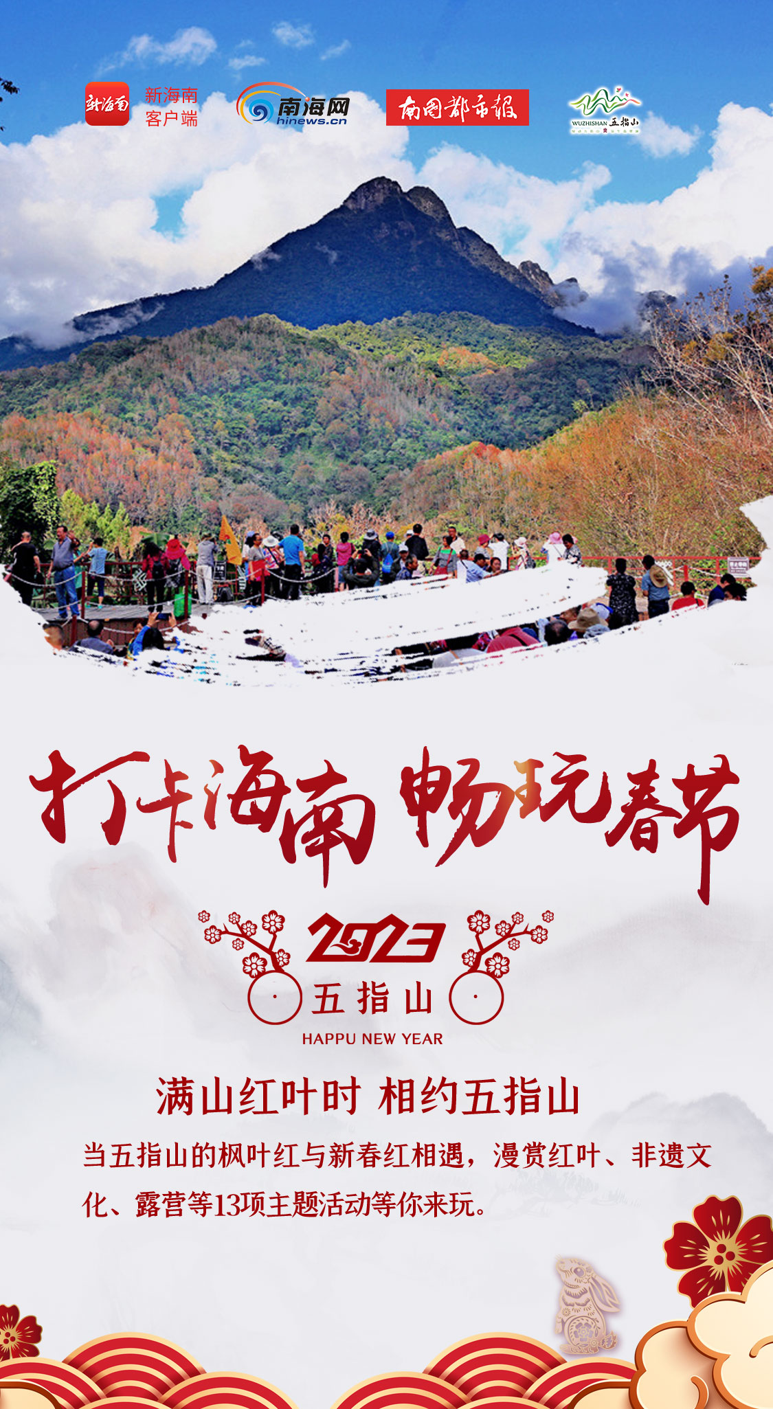1月14日,2023年五指山市紅葉文化旅游季啟動儀式暨山城好物年貨節正式開幕,本屆五指山市紅葉文化旅游季以“滿山紅葉時 相約五指山”為主題,未來1月至3月,海南五指山推出13項主題活動,亮點紛呈。