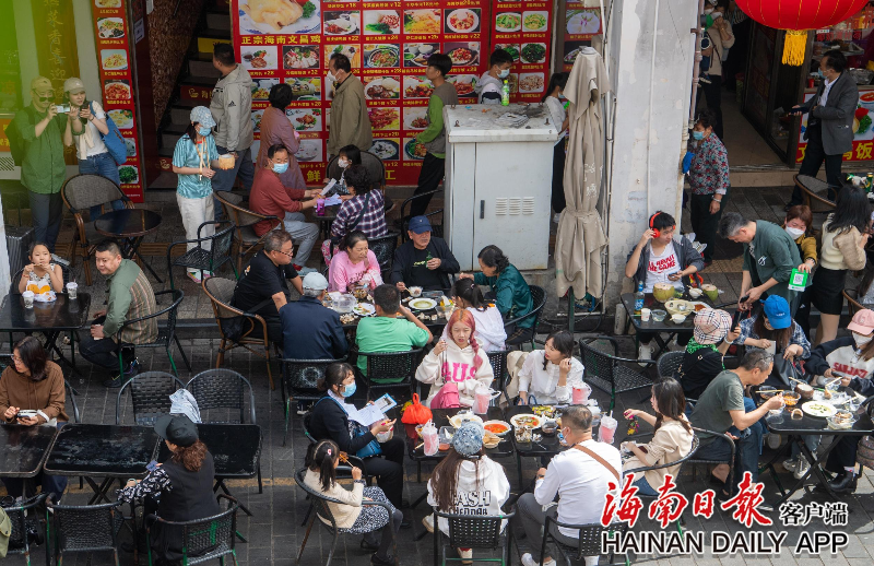 ?2023年1月23日,在海口騎樓老街,游客享受海南美食。