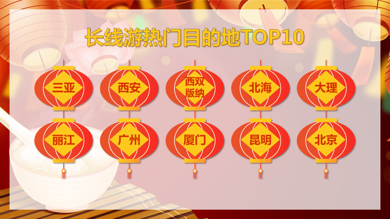 在經(jīng)歷了火熱的春節(jié)假期后,旅游消費(fèi)加速升溫。今年的元宵節(jié)又恰逢周末,有望進(jìn)一步推動(dòng)消費(fèi)需求的穩(wěn)步釋放。途牛旅游網(wǎng)數(shù)據(jù)顯示,長(zhǎng)線(xiàn)游方面,熱門(mén)目的地TOP10為:三亞、西安、西雙版納、北海、大理、麗江、廣州、廈門(mén)、昆明、北京。海南延續(xù)了春節(jié)假期的出游熱度,三亞的訂單量始終保持著較高水平。