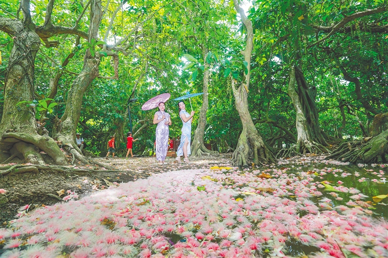 儋州市中和鎮七里村位于北門江畔,是一個有著1300年歷史的古老村莊。村里的玉蕊古樹群是全國保留最為完好的玉蕊古樹群之一。每年3月至10月,七里村400多畝的玉蕊古樹在夜間綻放粉紅的玉蕊花,花朵在月光映照下,如云如雪,嬌艷動人。至清晨時分,玉蕊花隨風飄落,散發出陣陣清香。作為全國鄉村旅游重點村和儋州美麗鄉村,七里村不僅有名花玉蕊,還有“儋縣抗日第一槍”遺址等歷史文化資源。市民游客可以去這里欣賞玉蕊花開的景致,參觀革命遺址,品味古村古韻。