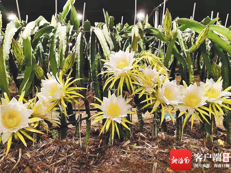 “火龍果是喜光耐陰的水果,在它的整個生長期中需要大量的光照,才會開花結果。當火龍果的光照不足,果實的糖分也會積累不足,甜度欠佳。所以通過在晚上適當地開燈,來彌補光照不足的問題,讓火龍果更好地進行光合作用,促進開花結果?!焙D纤麔u農業開發有限公司育才分揀中心經理裴琛說。