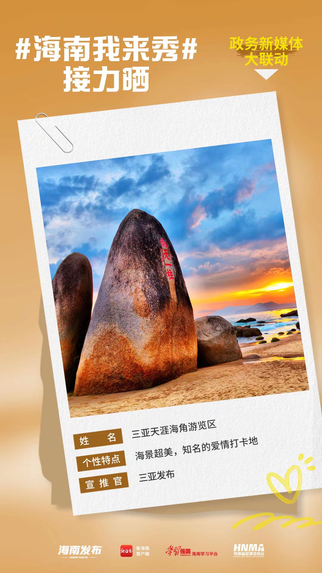 您可以在微博、抖音等平臺帶話題#海南我來秀 發布,記得帶上話題不迷路哦,讓小編看到你的作品,也許您的佳作會被海南發布、新海南客戶端、南海網、南國都市報采納并在官方賬號展示哦。