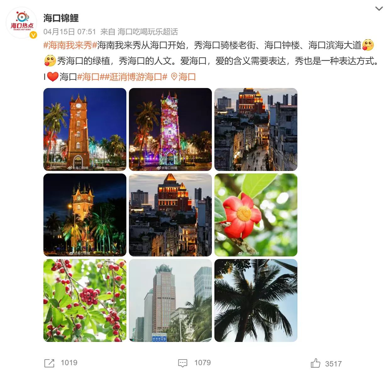 微博網友@海口錦鯉所曬的??隍T樓老街、??阽姌恰⒑?跒I海大道美景美輪美奐,一經發布立即引來眾多網友圍觀點贊,“秀海口的綠植,秀??诘娜宋摹酆??,愛的含義需要表達,秀也是一種表達方式”;網友@Choa999 所曬的“我眼中的觀海臺”,只見圖片中,碧海藍天映襯下的觀海臺充滿異域風情,潔白的浪花如潮涌來,十分吸睛。