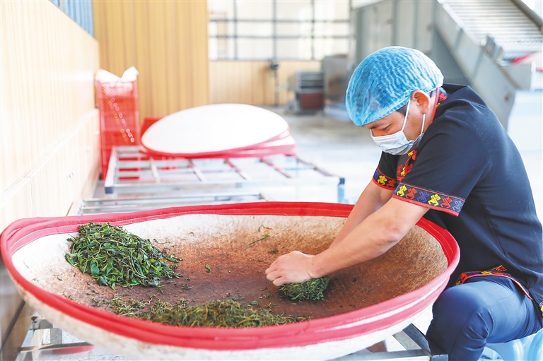 五指山市水滿鄉(xiāng)的一位茶農(nóng)在展示手工制茶。