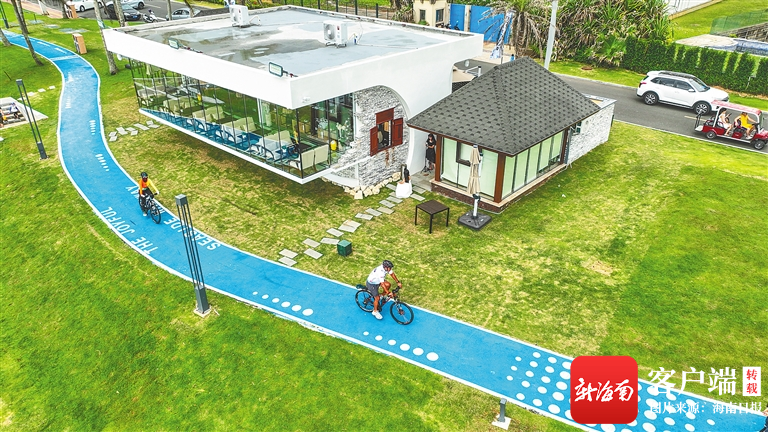 近日,在海南環島旅游公路瓊海博鰲段,市民游客在海濱小道和觀景臺上騎行、觀光。