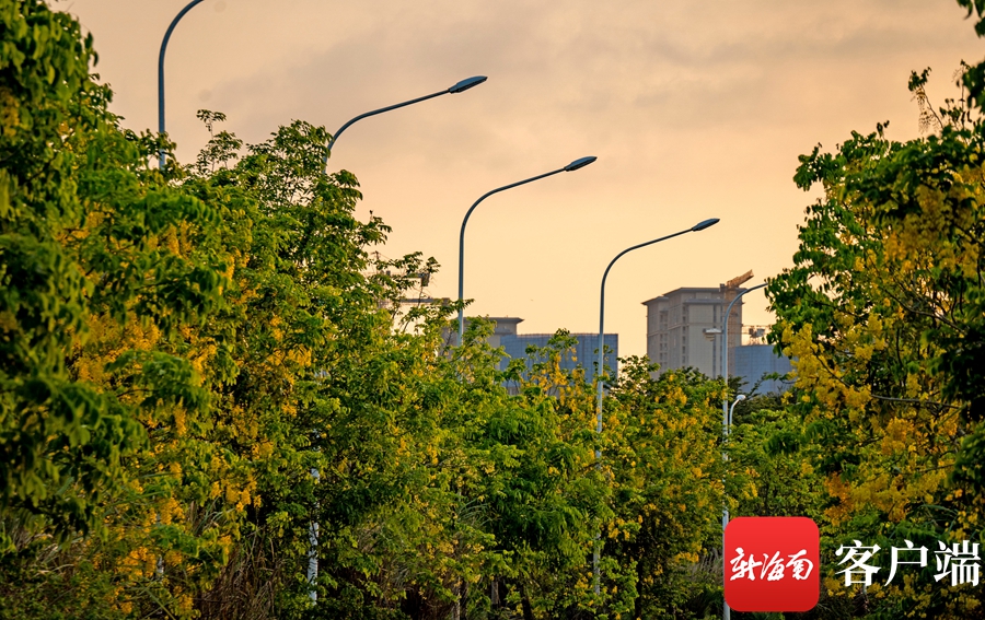 新海南客戶端、南海網、南國都市報5月16日消息(記者 劉孫謀)盛夏來臨,在海口市秀英區高龍路上,臘腸花一路盛放,花朵猶如黃金燦爛,隨風搖曳如雨落。