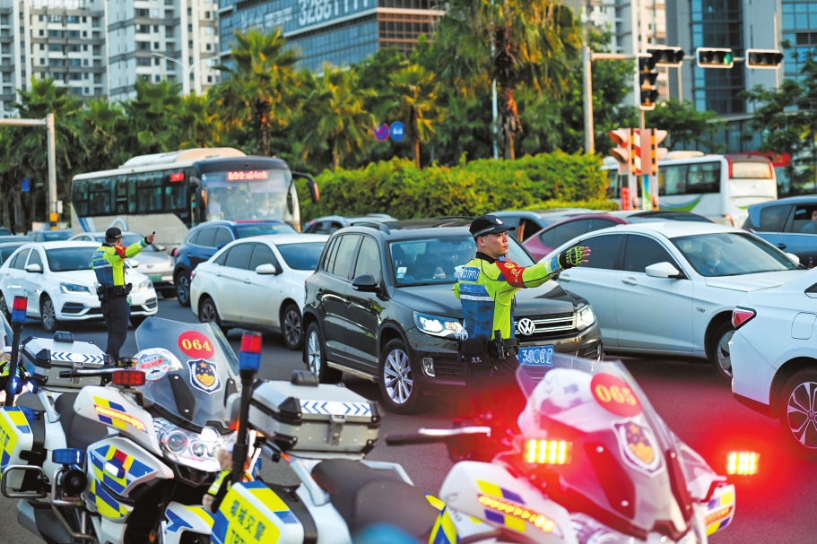 演唱會(huì)場館外圍,交警忙著疏導(dǎo)交通。海口日?qǐng)?bào)記者 石中華 攝